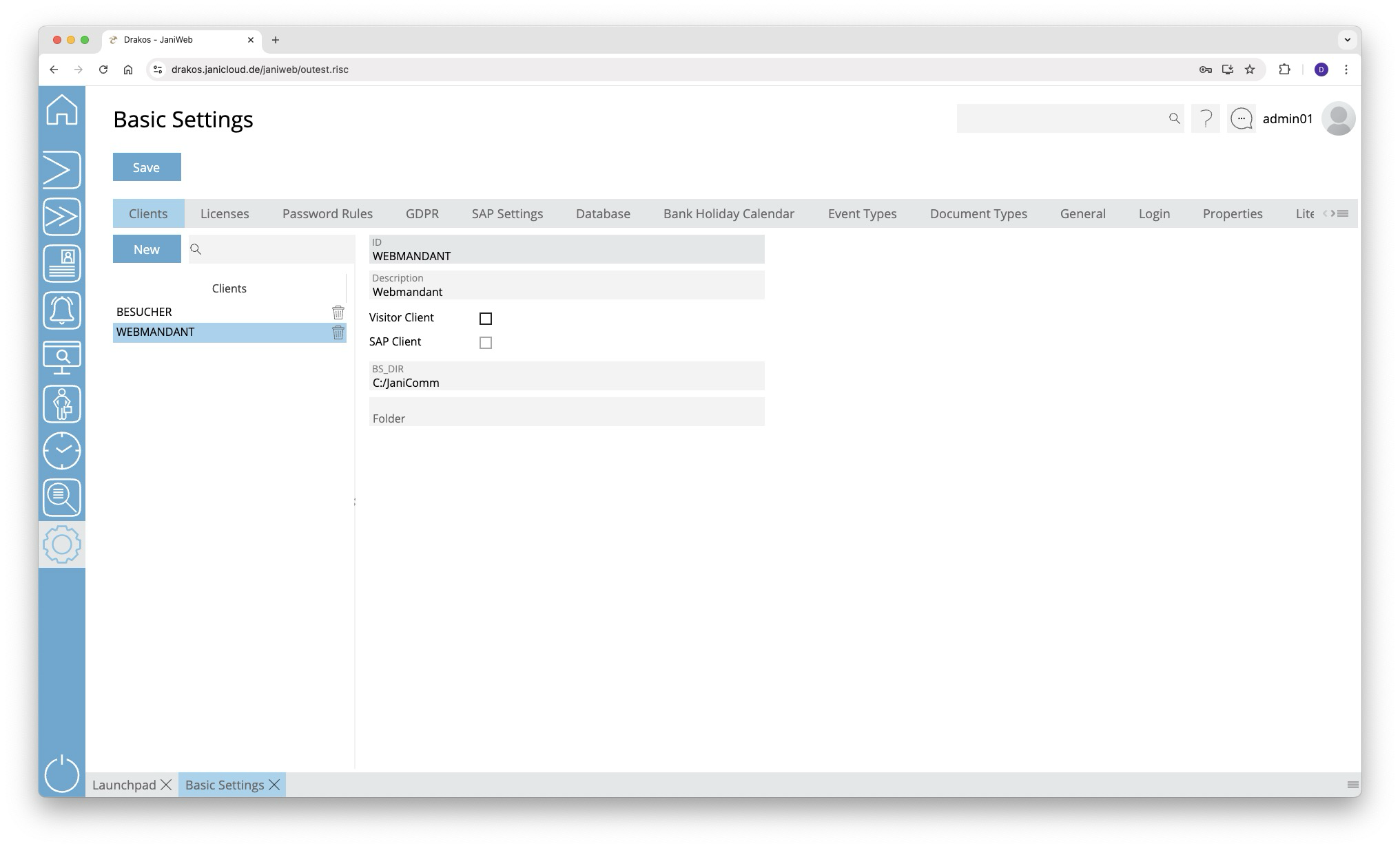 This is where you manage different clients in the system. Clients describe the origin of the data and are linked to the objects (e.g. persons, devices, device groups, etc.). The list contains the clients that have already been created. Select an entry to view details.