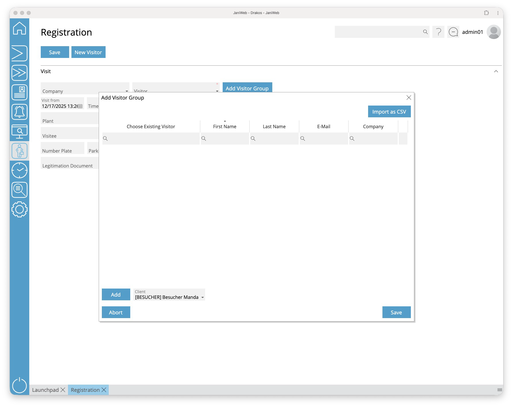 Use the Import as CSV button to import a visitor group from a CSV file. The structure of this CSV file can be found here.