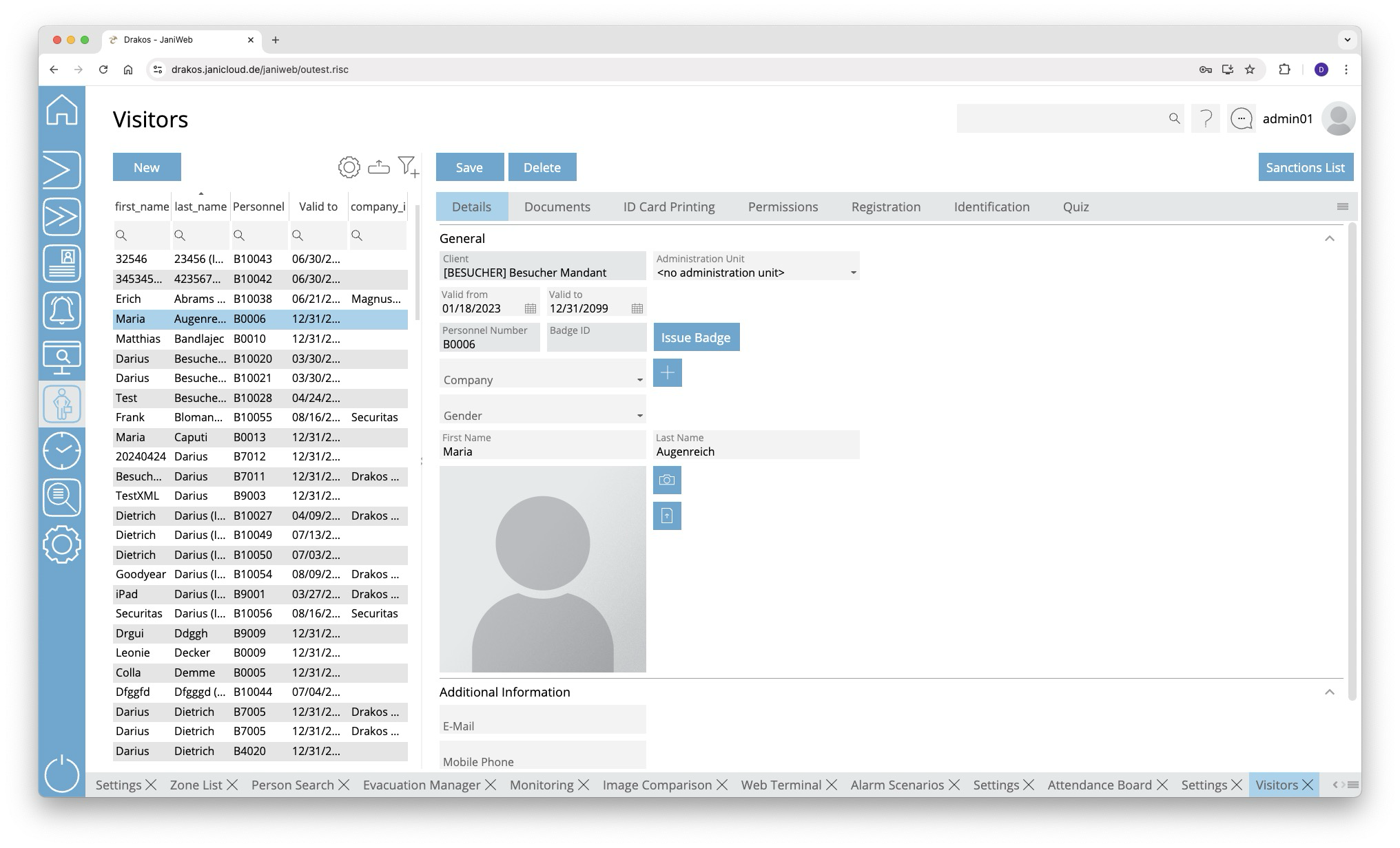 You can manage visitors in the system via the menu item Visitors. Here you can create new visitors and assign them to a company that has been created under the menu item Companies.