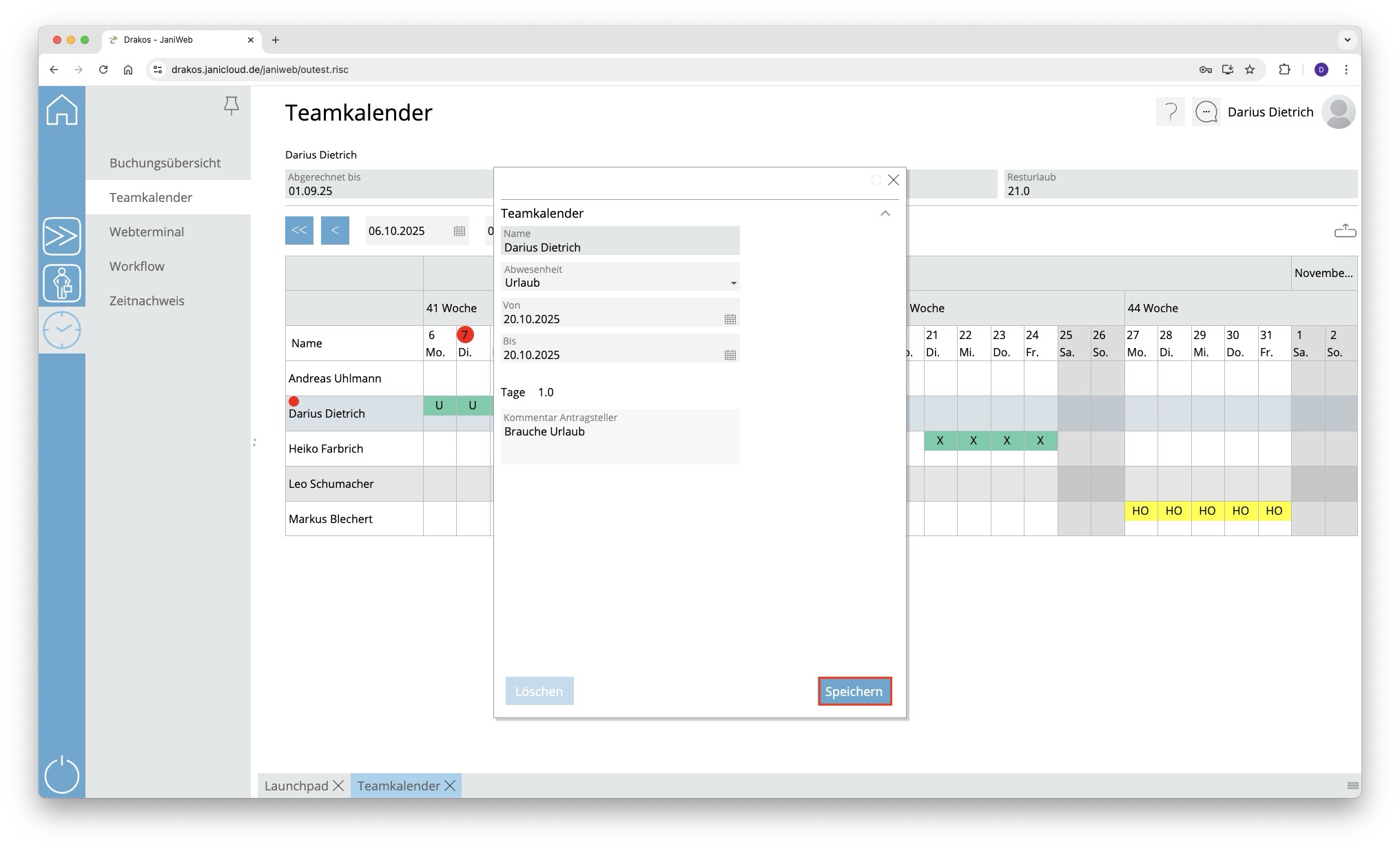 4. Daten für Von und Bis eingeben. Ggf. Kommentar für Vorgesetzten setzen. Mit Speichern bestätigen.