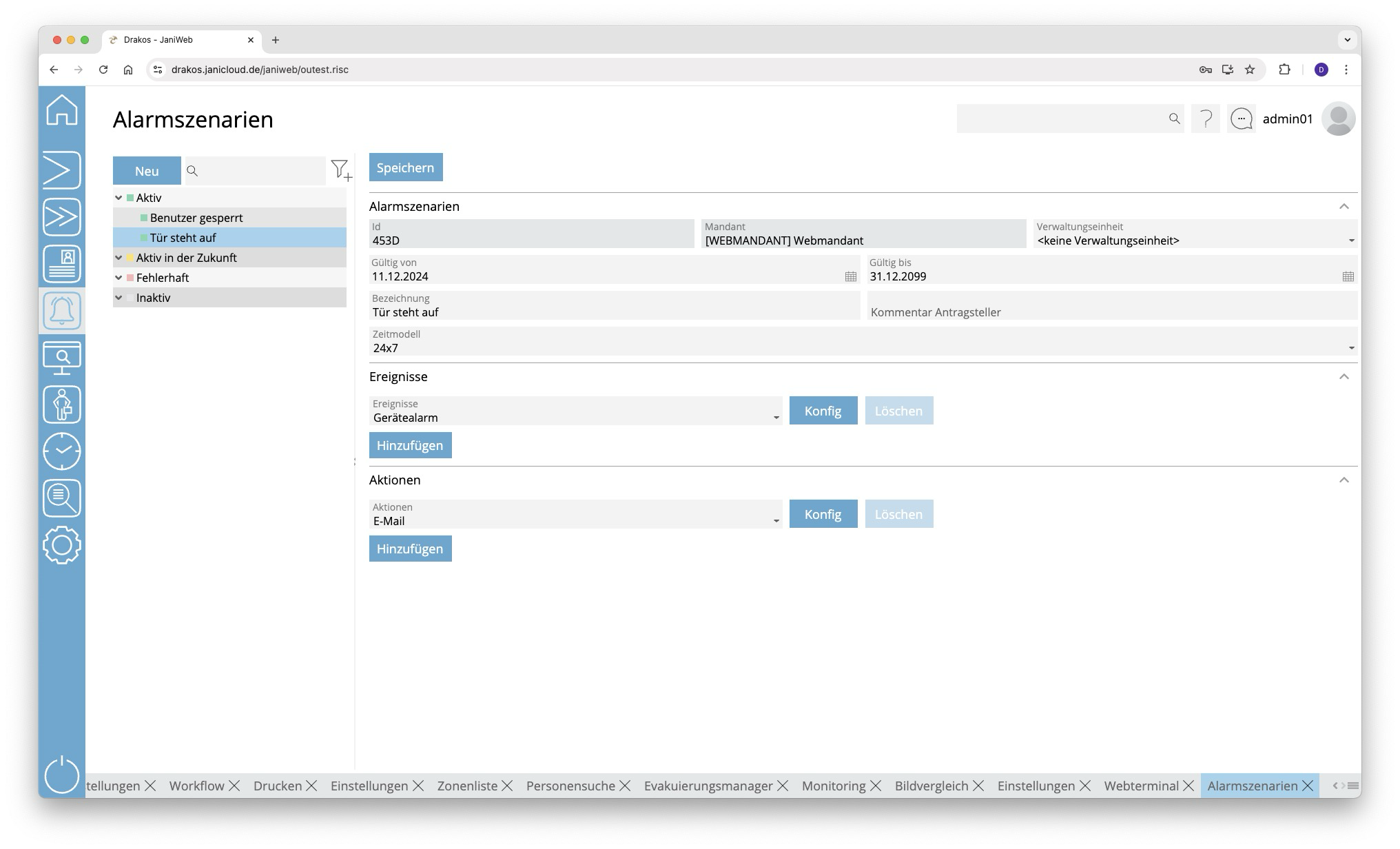 Unter dem Menüpunkt Alarmszenarien können Sie verschiedene Ereignisse und darauf folgende Aktionen festlegen.