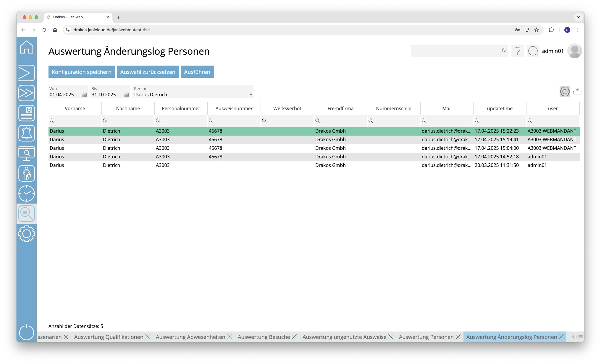 Die erste, grün hinterlegte Zeile zeigt Informationen zum aktuellen Datensatz der Person an. Die folgenden Zeilen zeigen die historischen Änderungen. Die Spalte Änderungszeit enthält Datum und Uhrzeit der Änderung. In der Spalte Benutzer erscheint der Benutzer, der die Änderung vorgenommen hat.