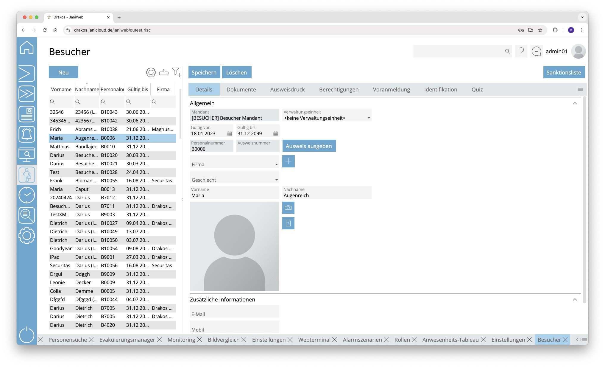 Die Liste enthält die bereits angelegten Besucher. Wählen Sie einen Besucher aus, um Details anzuzeigen. Die Liste bietet folgende Möglichkeiten: