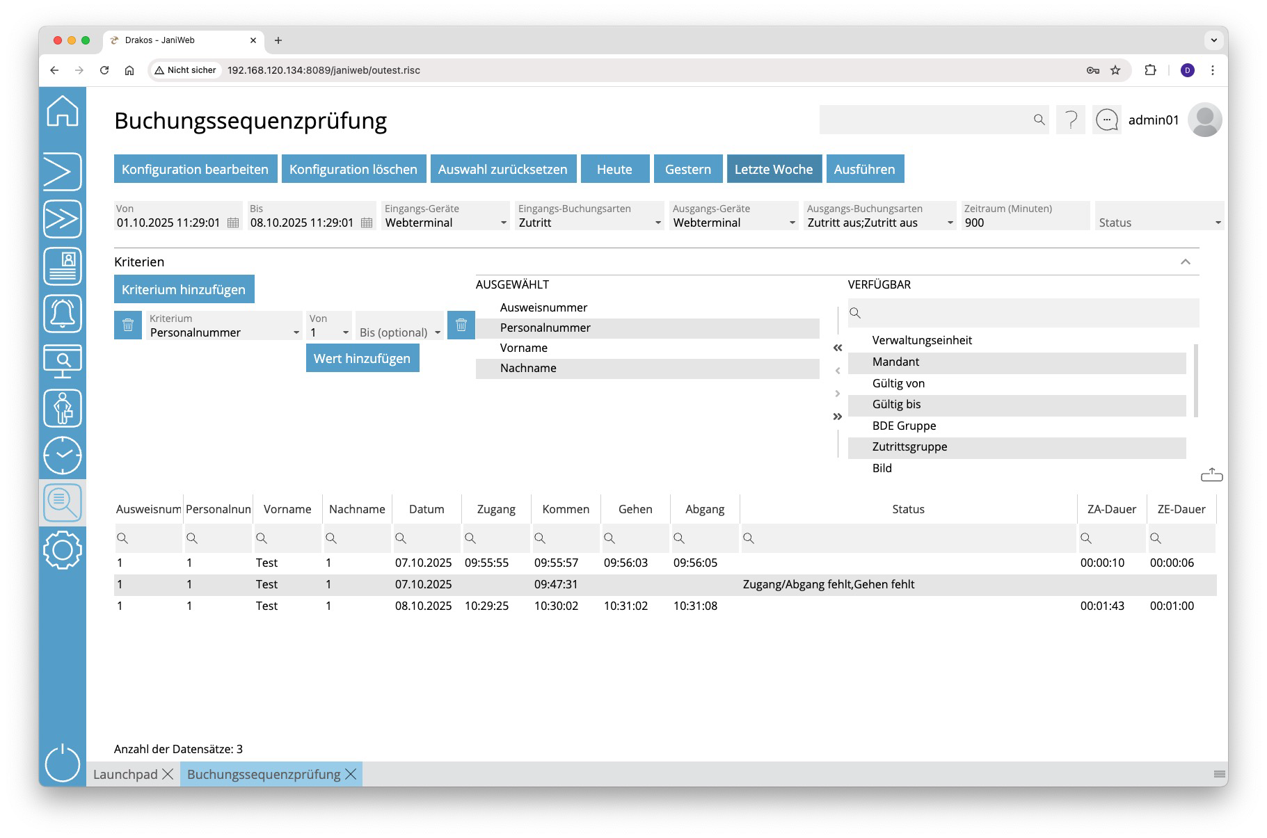 Über den Menüpunkt Buchungssequenzprüfung können Sie prüfen, ob Personen eine vorgegebene Reihenfolge der Buchungen von Eingang über Kommen und Gehen bis Ausgang eingehalten haben. Wenn die Prüfung fehlschlägt, wird eine entsprechende Statusmeldung im Ergebnis der Auswertung angezeigt.