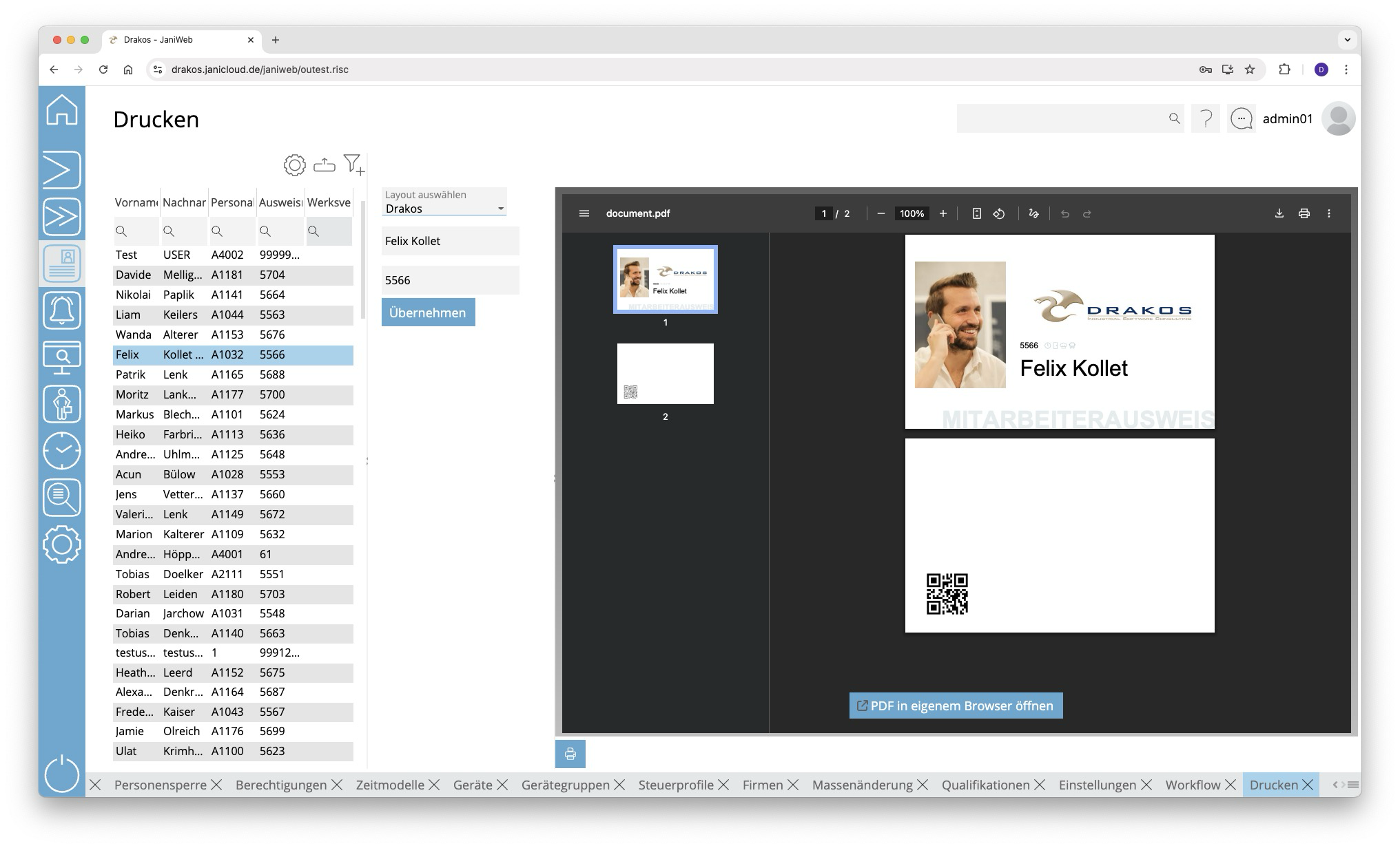 Wählen Sie eine Person aus, um eine Vorschau des zu druckenden Ausweises anzuzeigen.