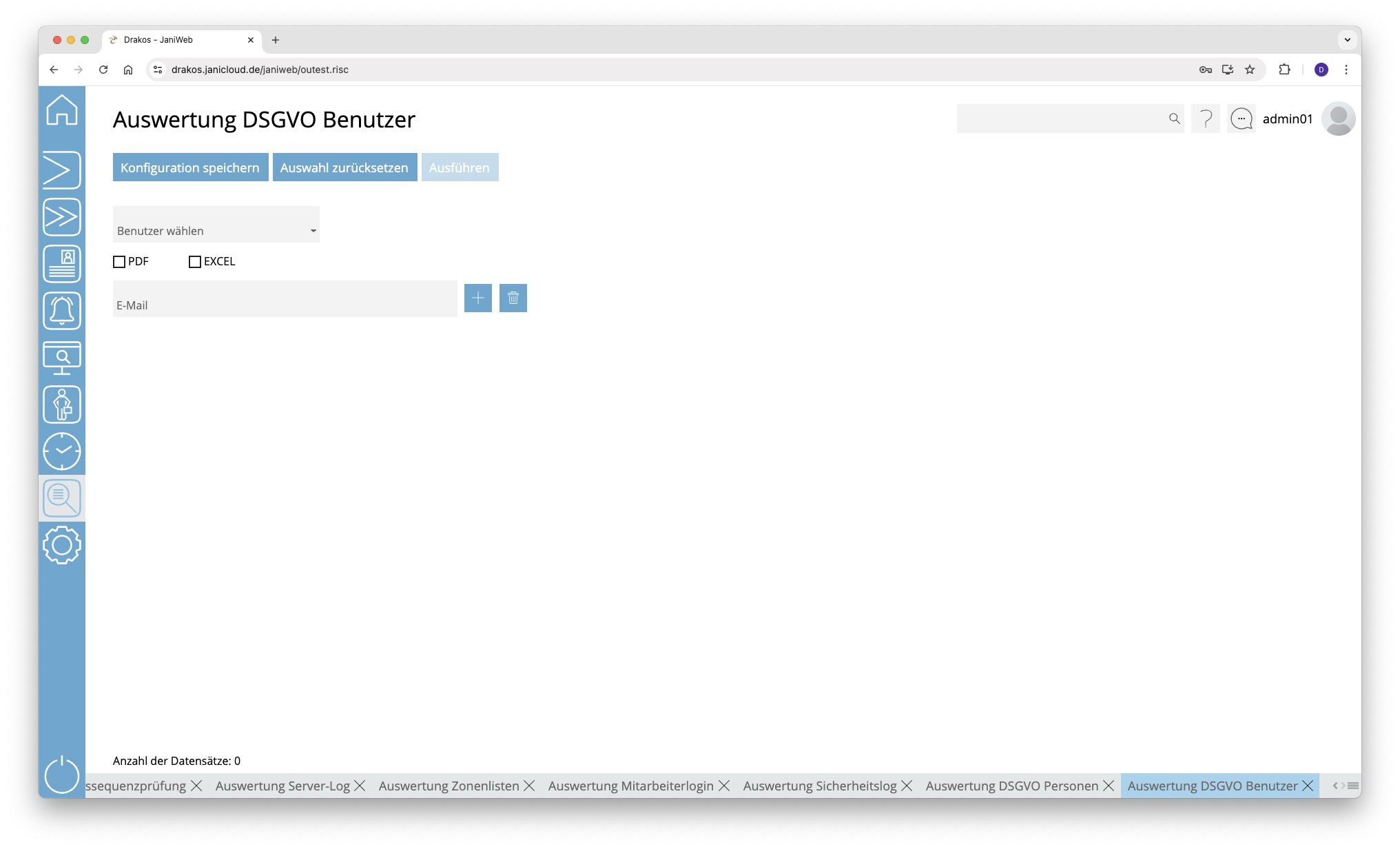 Über diesen Menüpunkt können Sie eine Liste aller Aktionen erstellen, die ein bestimmter Benutzer in JaniWeb ausgeführt hat, und an eine oder mehrere E-Mail-Adressen senden.