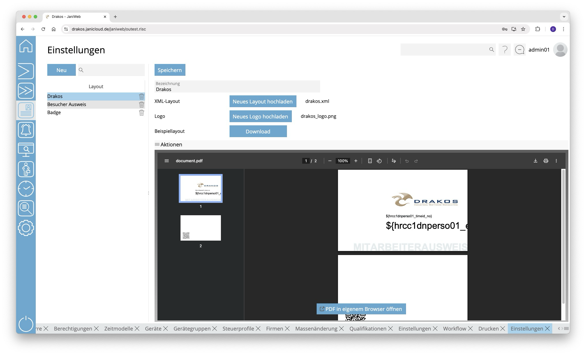 Über den Menüpunkt Einstellungen verwalten Sie verschiedene Layouts für Ausweise.