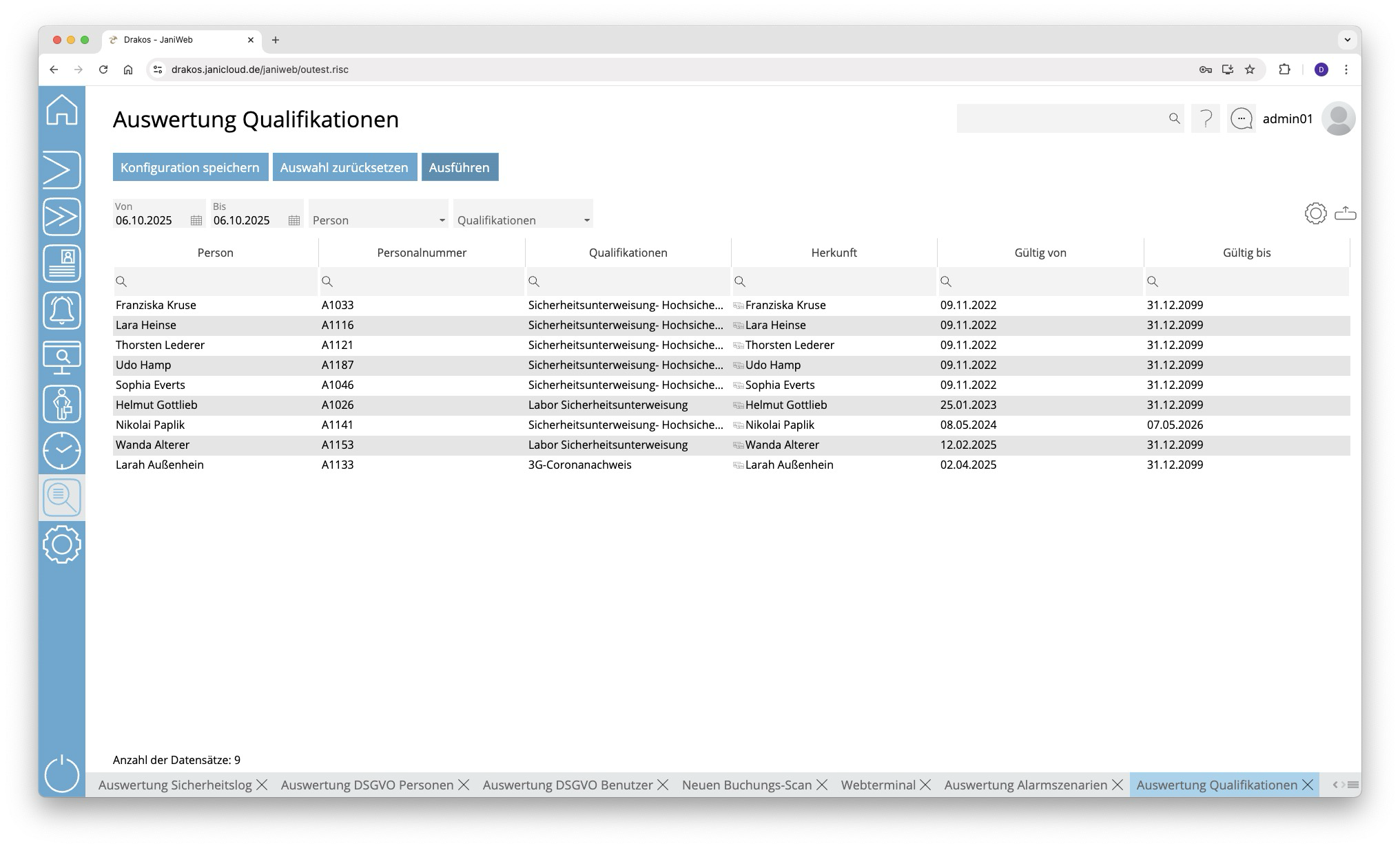 Über den Menüpunkt Qualifikationen können Sie eine Liste aller Personen mit zugewiesener Qualifikation zusammen mit dem Gültigkeitszeitraum der Qualifikation ausgeben.