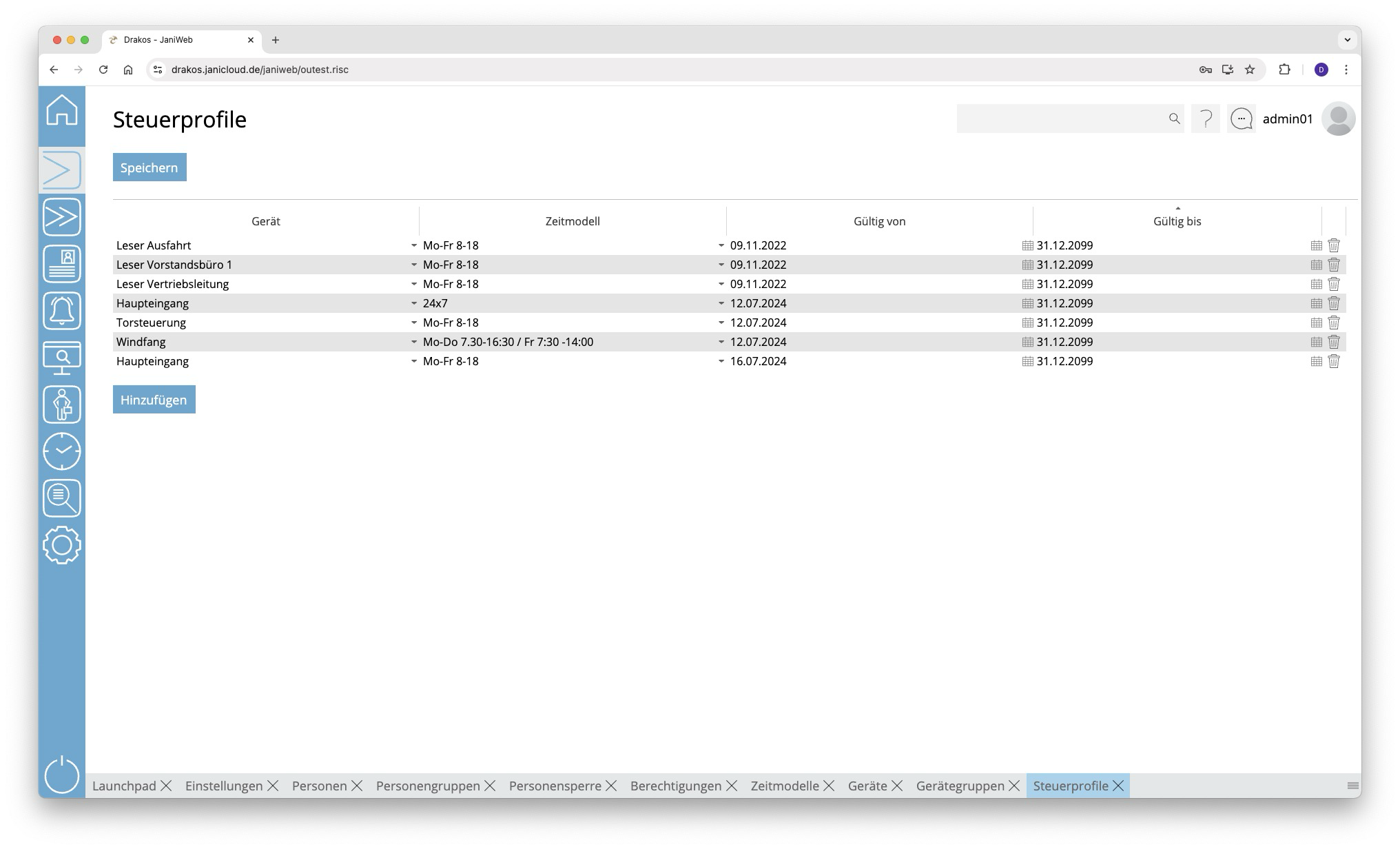 Über den Menüpunkt Steuerprofile können Sie Zeitmodelle mit Geräten verknüpfen um festzulegen, wann der Zutritt über die jeweilige Tür möglich sein soll.