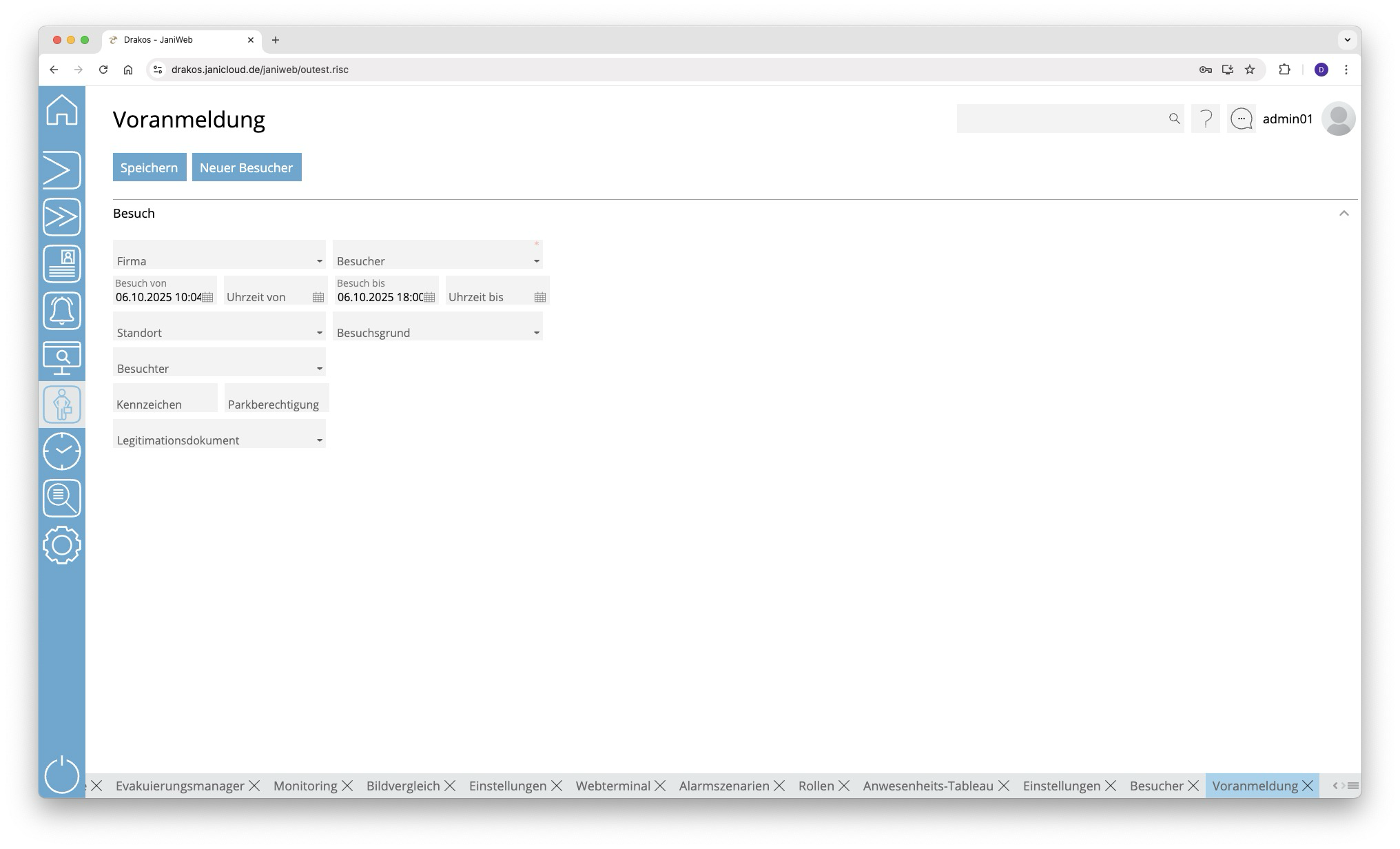 Geben Sie alle erforderlichen Informationen ein, und drücken Sie auf Speichern. Der angemeldete Besucher erscheint anschließend im Menüpunkt Besuche unter Kommend.