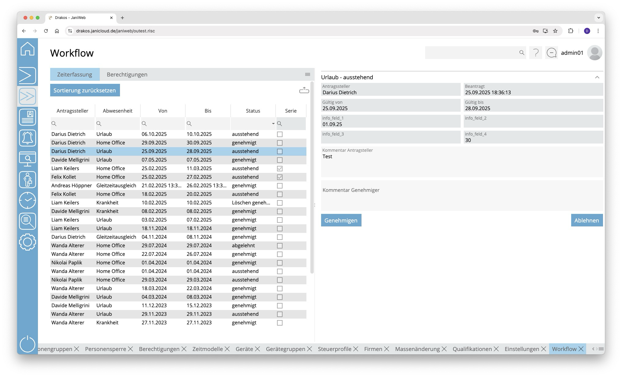 Im Menü Workflow können Sie den Status Ihrer Workflow-Anträge (z. B. Buchungen, Abwesenheiten (Zeiterfassung) oder Berechtigungen) einsehen.