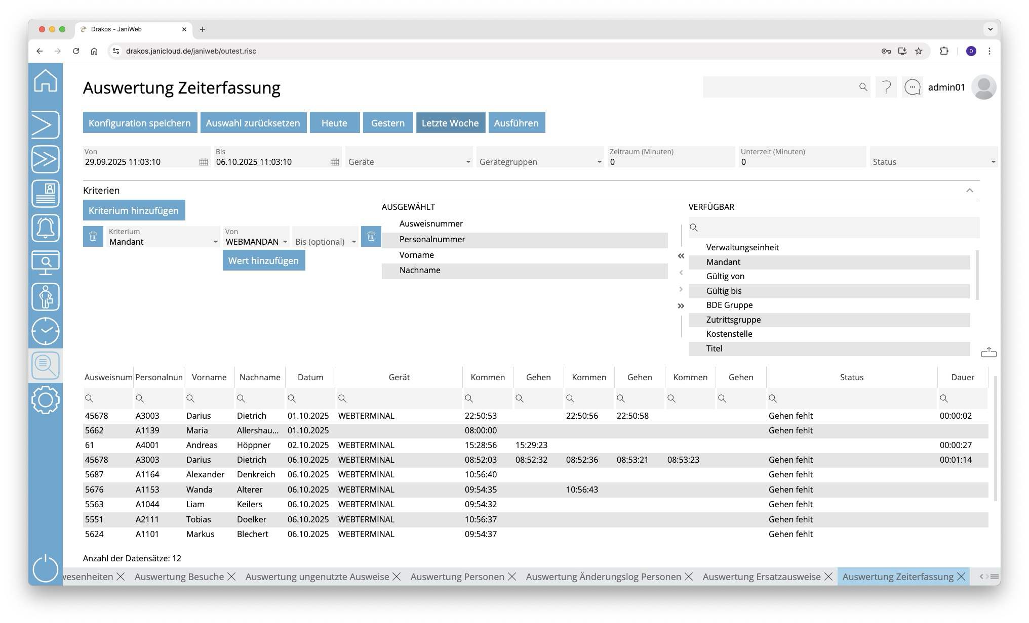 Über den Menüpunkt Zeiterfassung können Sie prüfen, ob Personen die vorgegebene Reihenfolge von Kommen und Gehen Buchungen eingehalten haben. Wenn die Prüfung fehlschlägt, wird eine entsprechende Statusmeldung im Ergebnis der Auswertung angezeigt.