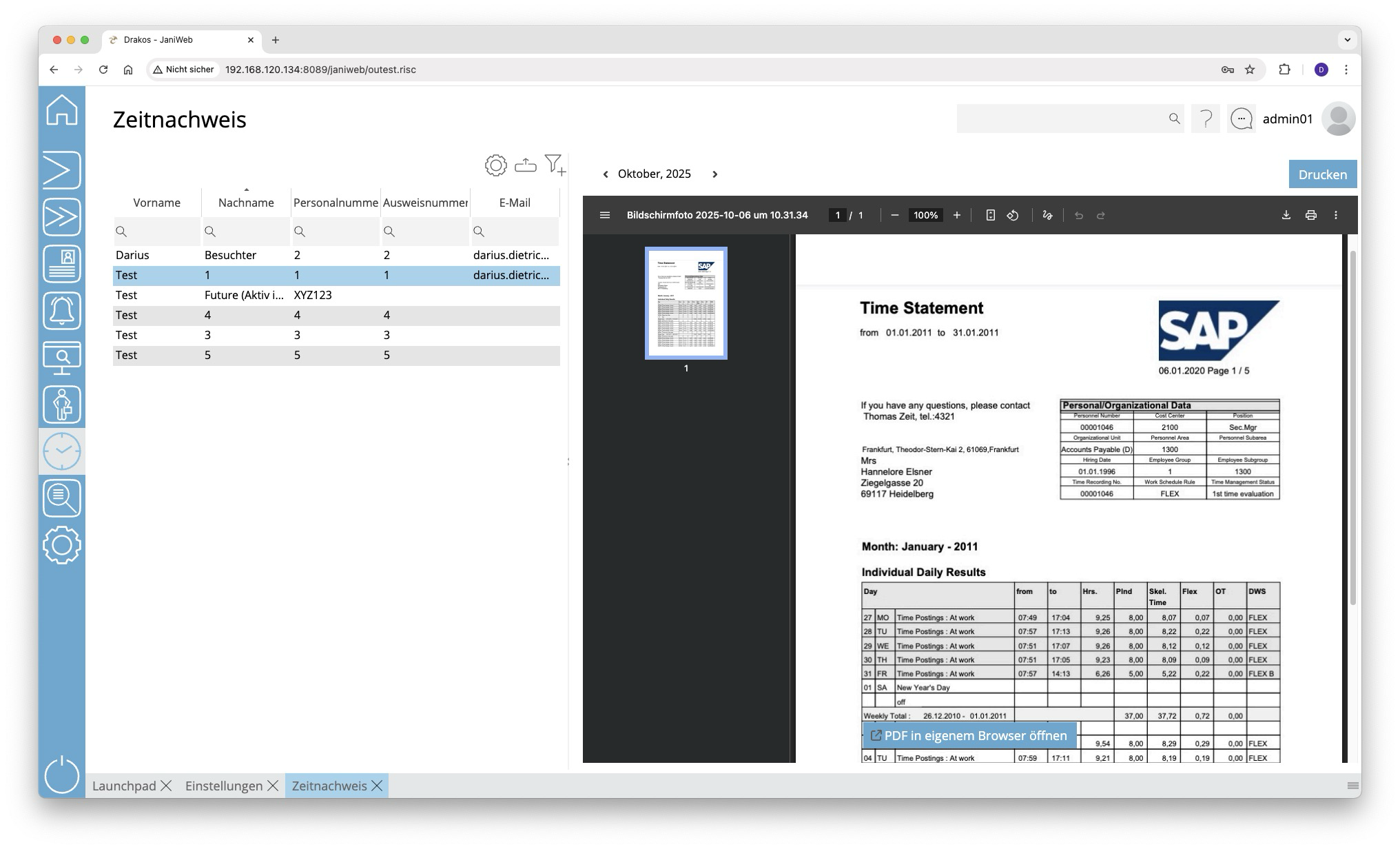 Die Liste der Personen ist nur mit einer Anmeldung als Administrator sichtbar. Über eine Anmeldung als Mitarbeiter ist nur der eigene Zeitnachweis sichtbar.